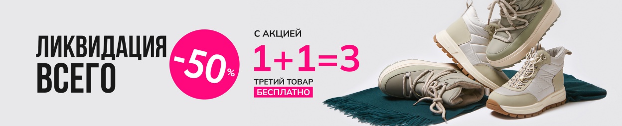 Условия акции: на весь ассортимент обуви предоставляется скидка -50%, а при приобретении товаров из ассортимента обуви и сумок, на третий товар с наименьшей ценой в чеке предоставляется скидка 100%. Скидка, равная 100% стоимости третьего товара, расписывается в чеке путём пропорционального уменьшения стоимости каждого приобретаемого товара. Скидка по акции не суммируется со скидкой по дисконтной карте и списанием бонусов. На товары, приобретенные по акции, может быть предоставлена рассрочка. Товары по акции невозможно приобрести по сертификатам и промокодам с определенным номиналом. Подробности у консультантов.