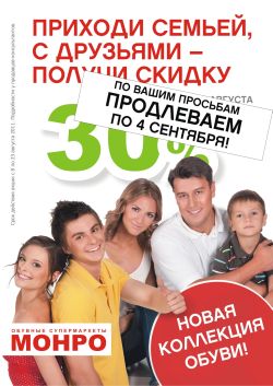 Приходите с семьей, с друзьями - получите скидку 30%!!! Чем больше покупаете (обувь, колготы, сумки и др), тем больше скидку получаете - 20, 25%, 30%! В том числе и на новую коллекцию! Подробности у продавцов консультантов. Акция действует с 8 августа по 4 сентября 2011 г. Скидки по акции не суммуруются со скидками по другим акциям и скидками по дисконтной карте.