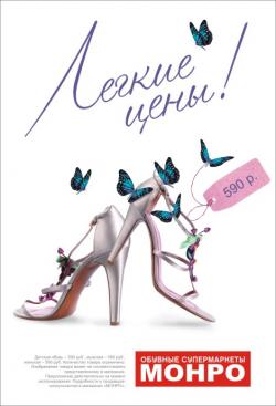 С 20 апреля 2012 в обувных супермаркетах «Монро» города Ростов-на-Дону действуют «Легкие цены»: женская и мужская обувь летней коллекции по 590 рублей, детская - по 390 рублей*!