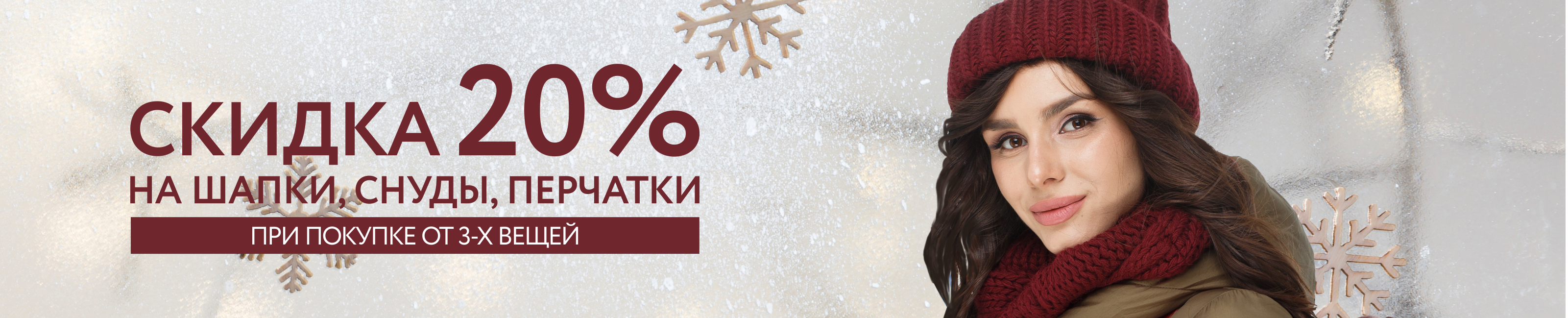 Условия акции: при покупке трёх и более товаров из ассортимента аксессуаров: шапок, снудов, палантинов, шарфов, перчаток, варежек, рукавиц, предоставляется скидка 20% на все товары данных групп в чеке. Скидка не суммируется со скидкой по дисконтной карте. Товары по акции могут быть предоставлены в рассрочку.